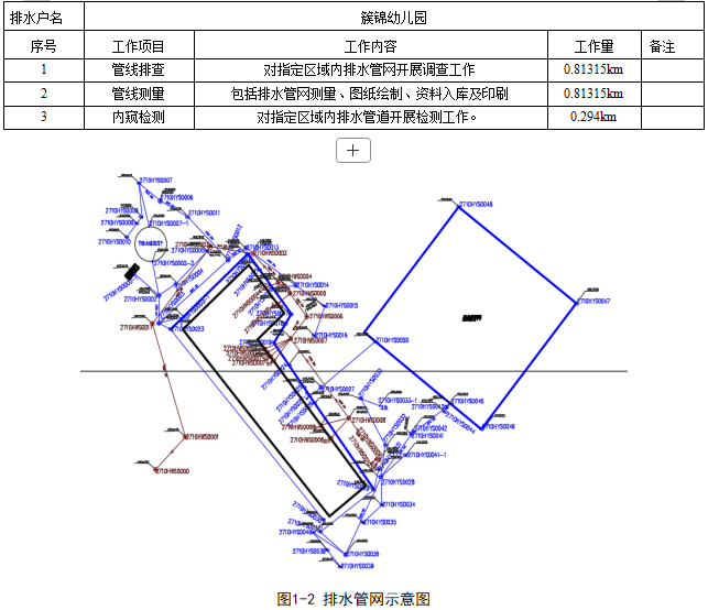 此次排水戶調(diào)查工作于2021年3月4日~2021年3月30日期間開展,完成“簇錦幼兒園”排水戶的排水管線摸查、管線測繪、管道檢測(QV)工作,完成工作量情況見表1-1、排水管網(wǎng)示意圖見圖1-2;詳細(xì)成果資料清單見表3-1、附圖WH-2710-00。