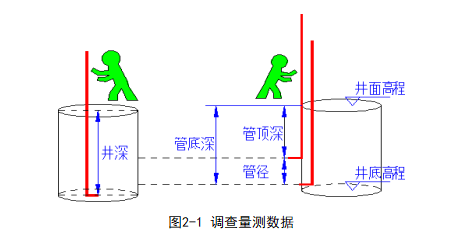 實(shí)地調(diào)查主要采用定制的L型鋁管標(biāo)尺(帶刻度,可組裝拆卸)、可視化激光測距儀(可查看井下情況,定點(diǎn)測量距離)及鋼卷尺等工具設(shè)備。調(diào)查時采用鋁管標(biāo)尺量測直讀設(shè)施深度,利用鋁管標(biāo)尺的L型號勾頭探查管道口的方向及管頂、管底深度(管底深度減去管頂深度即可得到管徑);對于截面積較大的溝渠或是底部空間較大的窨井等可利用可視化激光測距儀對設(shè)施內(nèi)部情況進(jìn)行查看,定點(diǎn)測量距離、尺寸等。