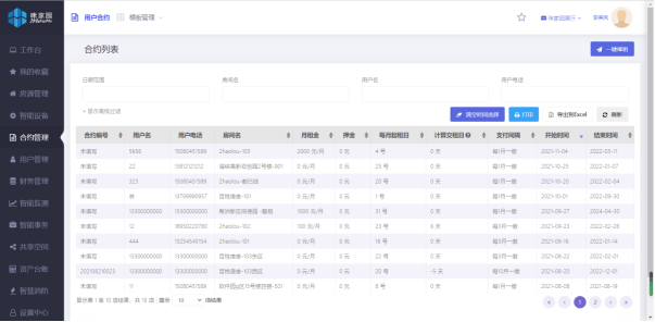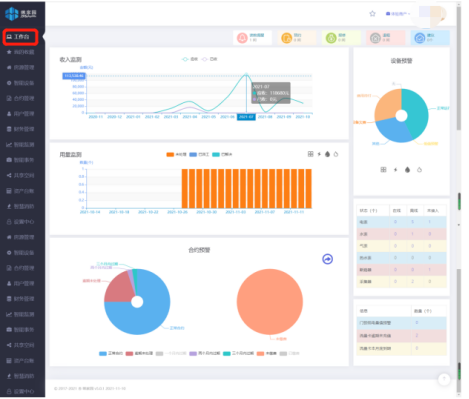 工作臺 | 1、能夠直觀的看出各個時間段應(yīng)收已收費用情況; 2、各個時間段的水電費收入情況; 3、智能水電表的相關(guān)預(yù)警信息一目了然; 4、合同到期情況及預(yù)警、費用繳納情況及預(yù)警; | ||||