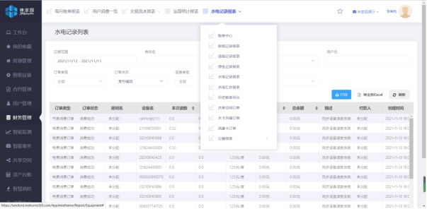 財務(wù)管理 | 系統(tǒng)將會向?qū)W生推送與學生關(guān)聯(lián)的電子賬單,賬單類型至少應(yīng)包括水電能源繳費通知;系統(tǒng)中可以查看到全部賬單的信息狀態(tài),對賬單進行篩選查詢,對單個賬單進行打印,以方便財務(wù)人員進行賬單核對等操作。 消費明細功能(設(shè)備消費明細、學生消費明細),流水對賬、退款審核、錢包充值查詢、卡片充值查詢; 1、每月賬單報表:房源單月水電費繳費狀況,顯示費用類型; 2、學生消費一覽:每日消費報表,需包括字段有:日期、房間名、學生姓名、交易流水單號、費用類型、交易金額、手續(xù)費、入賬金額數(shù)據(jù)匯總,需區(qū)分平臺交易和非平臺交易。 3、水電匯總報表:可自定義某個時間段匯總,報表細項可自定義; 4、交易流水報表:水電記錄報表: | ||||