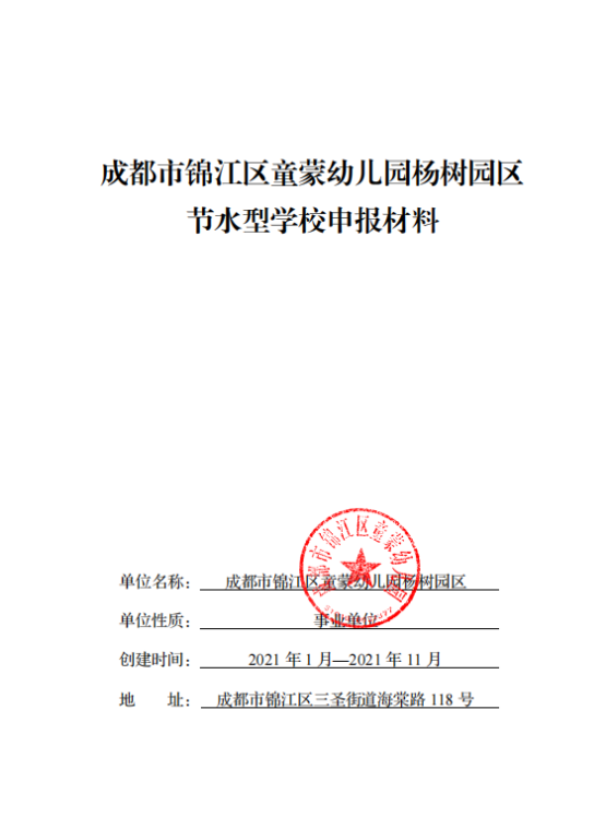 2021年四川省觸點(diǎn)水平衡科技公司順利協(xié)助成都市錦江區(qū)童蒙幼兒園楊樹(shù)園區(qū)完成節(jié)水型學(xué)校申報(bào)成功。
